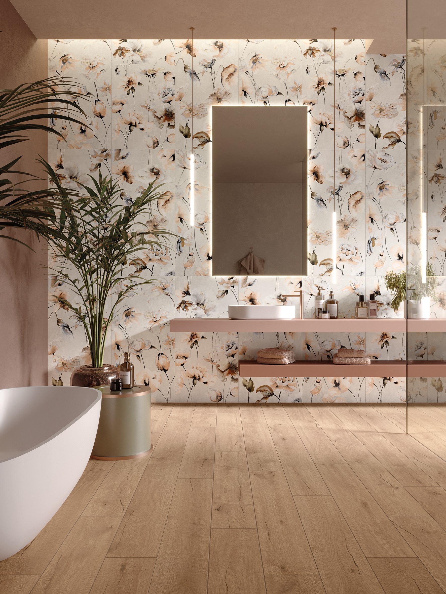 Le superfici si distinguono per le geometrie fluide e i motivi delicati, capaci di creare composizioni eleganti e dinamiche. Grazie a una palette cromatica raffinata e contemporanea, Bloom si integra perfettamente in spazi residenziali e contract, donando carattere senza rinunciare alla sobrietà.