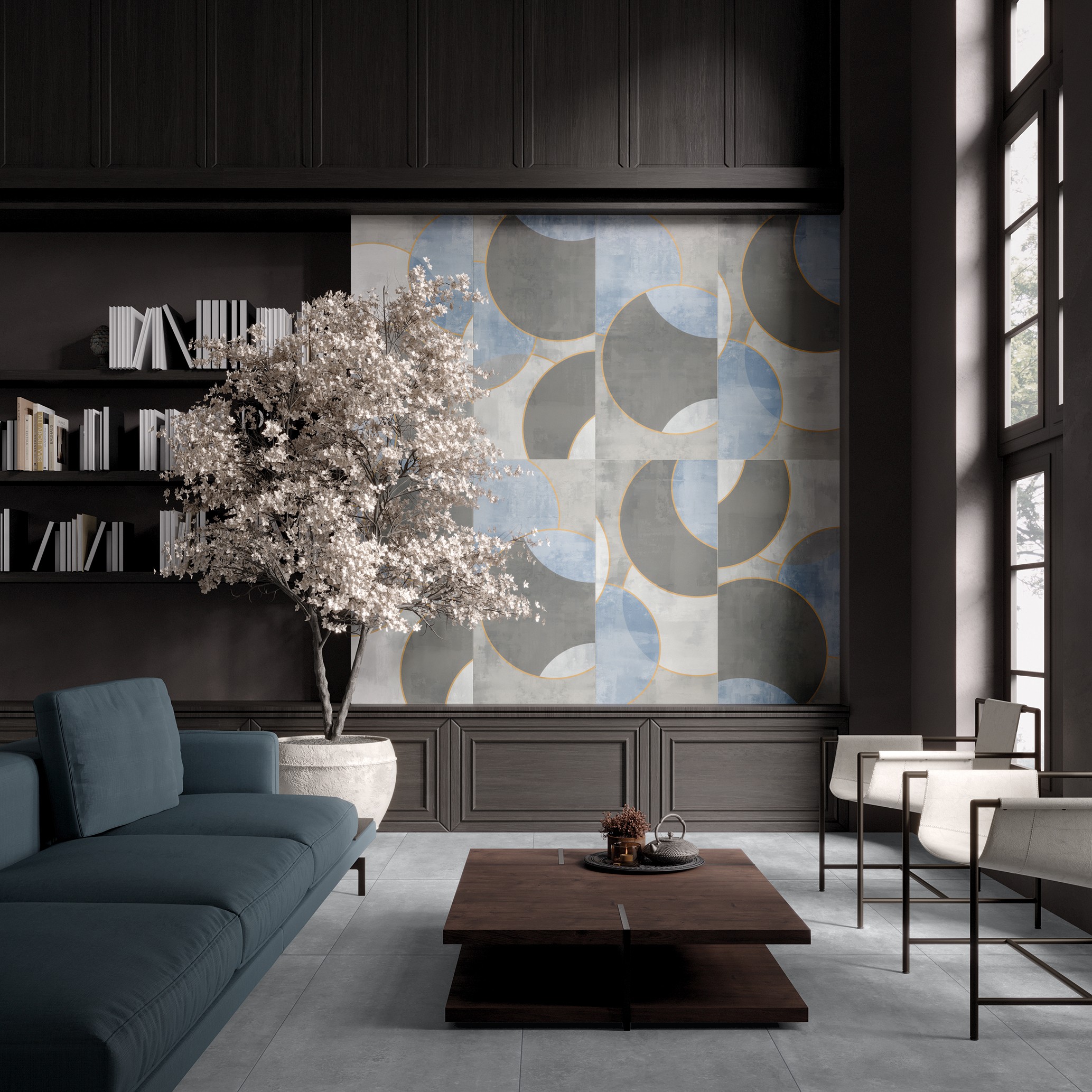I moduli della collezione permettono composizioni versatili e creative, in cui le linee curve si intrecciano generando pattern contemporanei e raffinati. Le finiture materiche e le tonalità ricercate valorizzano la luce, contribuendo a creare spazi luminosi e di grande impatto visivo.