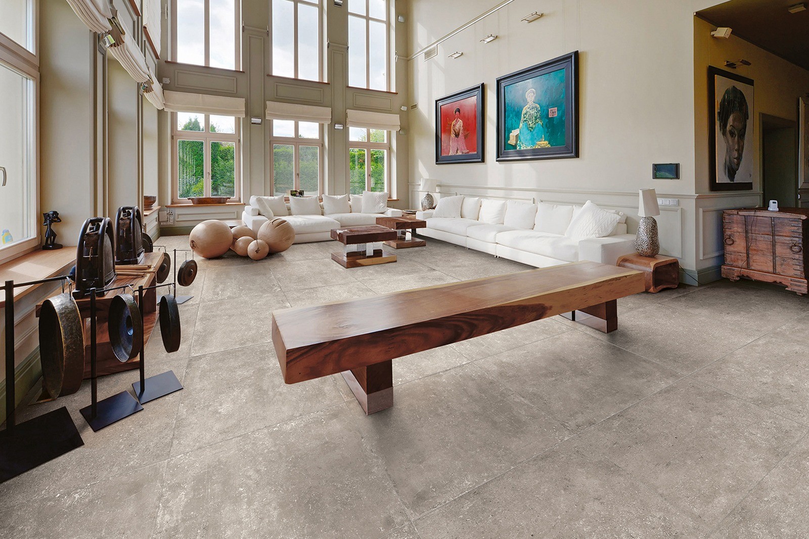 Umbria Antica Grigio di Tagina è un pavimento in gres porcellanato effetto pietra che richiama le atmosfere autentiche e materiche delle pavimentazioni storiche umbre, reinterpretate in una tonalità grigio medio naturale.
